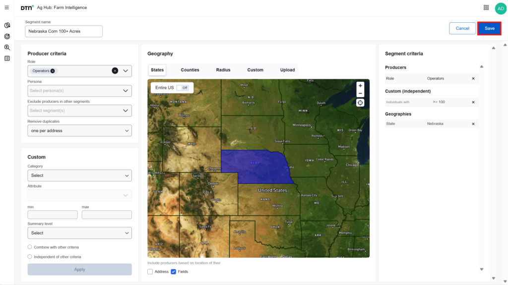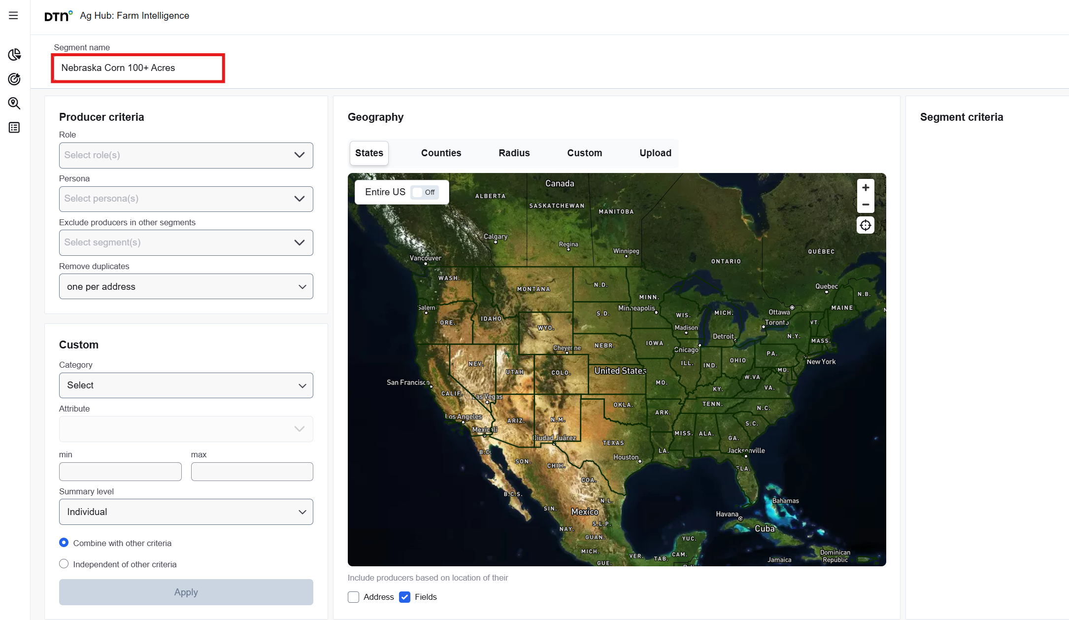 The ‘Farm Operation’ criteria provide data-driven filters to refine your segment. Begin by selecting a category; based on your selection, additional fields will appear. To ensure that producers within the segment operate farms with specific characteristics, it is recommended to apply one or more ‘Farm Operation’ criteria. You may include multiple criteria as needed. After selecting a category and its corresponding attribute, define a minimum and/or maximum threshold. If the minimum value is left blank, a default of zero will be assumed. If the maximum value is omitted, only the minimum threshold will be applied.
