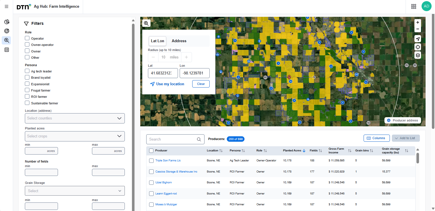 A list of nearby producers and fields will be displayed below the map and also overlaid directly on the map for easy reference.